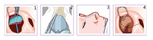 取出隆鼻假体手术前须进行常规鼻部检查,注意清洁。取出隆鼻假体手术在局部麻醉下进行,从鼻孔内缘做切口,做出通往假体处的通道,取出假体,再注射生理盐水于原置假体腔隙进行清洗,之后缝合切口,根据患者情况意愿还可重新设计并植入新的假体材料进行隆鼻。