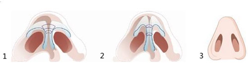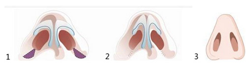 鼻翼缘宽大缩小术:可部分切除鼻翼之游离缘,缩小鼻翼,修整后切口缝合至鼻翼内面。