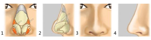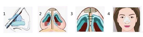 鼻小柱下垂:通过鼻中隔前端切除,膜性鼻中隔切除,内侧脚前端切除,三种方法根椐不同情况进行矫正。