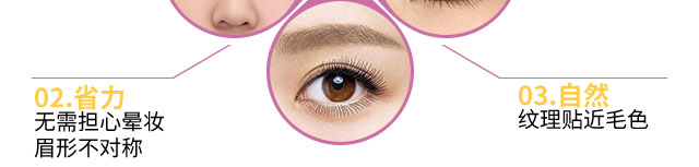 是将化妆技术与纹绣技术结合打造出的眉毛,做完之后跟眉粉扫过一样,轻奢韵眉是片状。融入美妆素描设计理念 ,根据不同年龄,职业,肤色,脸型设计出符合不同人群的眉形。
